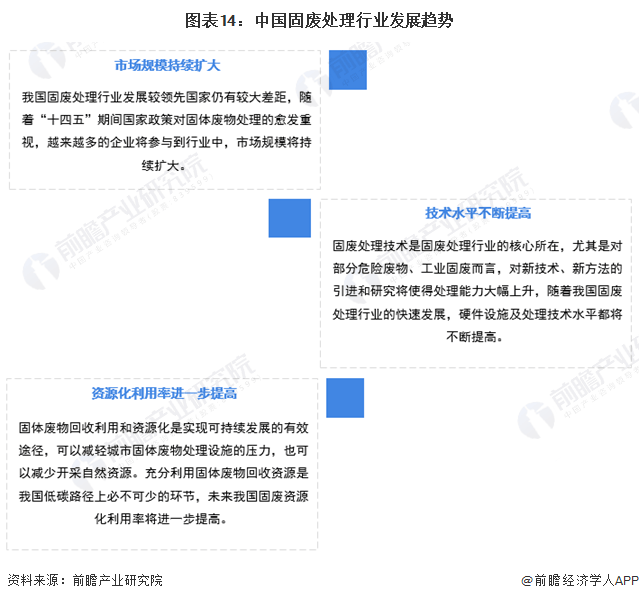 我国固废处理行业发展趋势主要有市场规模持续扩大、技术水平不断提高、资源化利用率进一步提高三个方面。