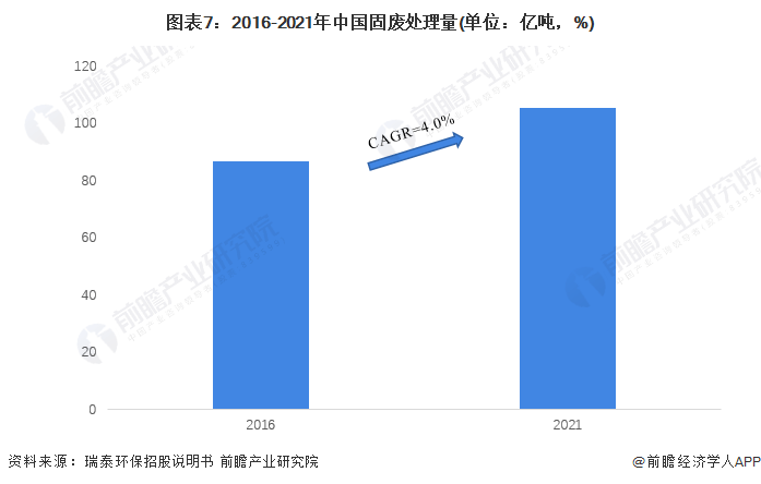 全球低碳大环境下,我国环保产业整体发展良好,固废处理能力不断提高。瑞泰环保招股说明书数据显示,2016-2021年,中国固废处理量由86.86亿吨上升至105.52亿吨,年复合增长率约为4.0%。