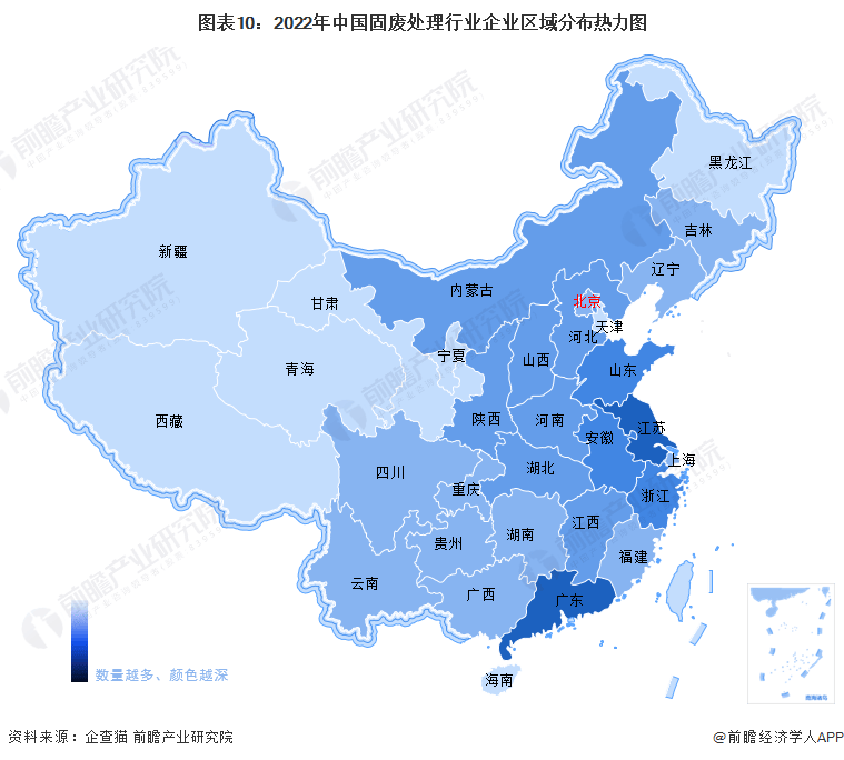 从企业区域分布来看,我国固废处理行业企业集中在华东地区。根据企查猫数据,截至2022年9月,江苏省固废处理相关企业数量超过1000家,位列全国第一、广东、安徽、山东和浙江省企业数量也均超过500家。